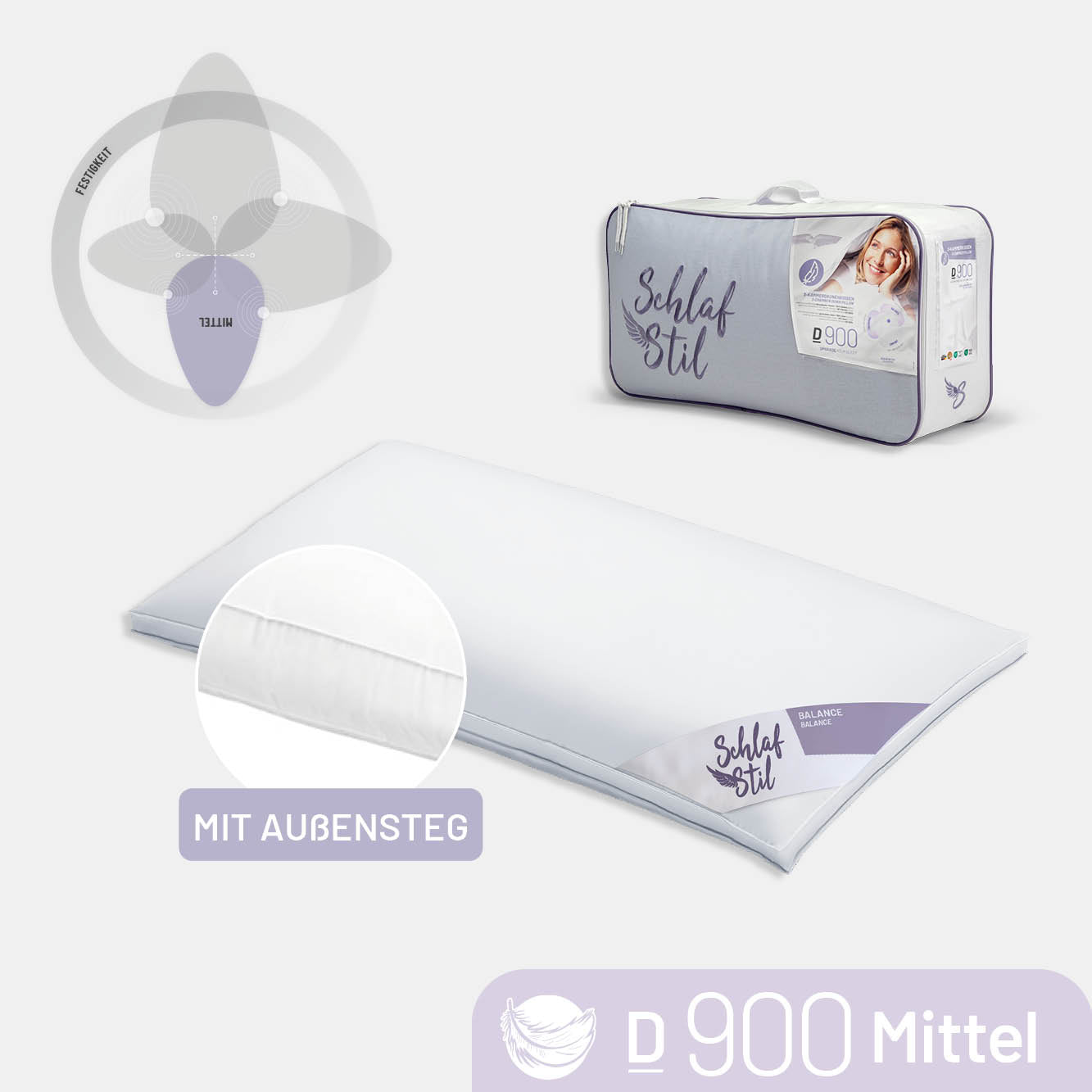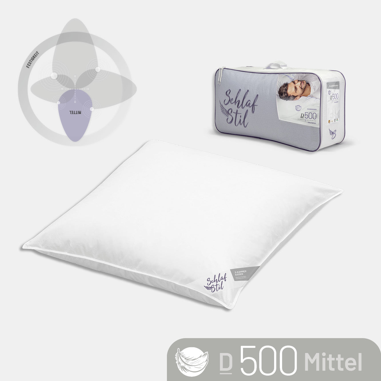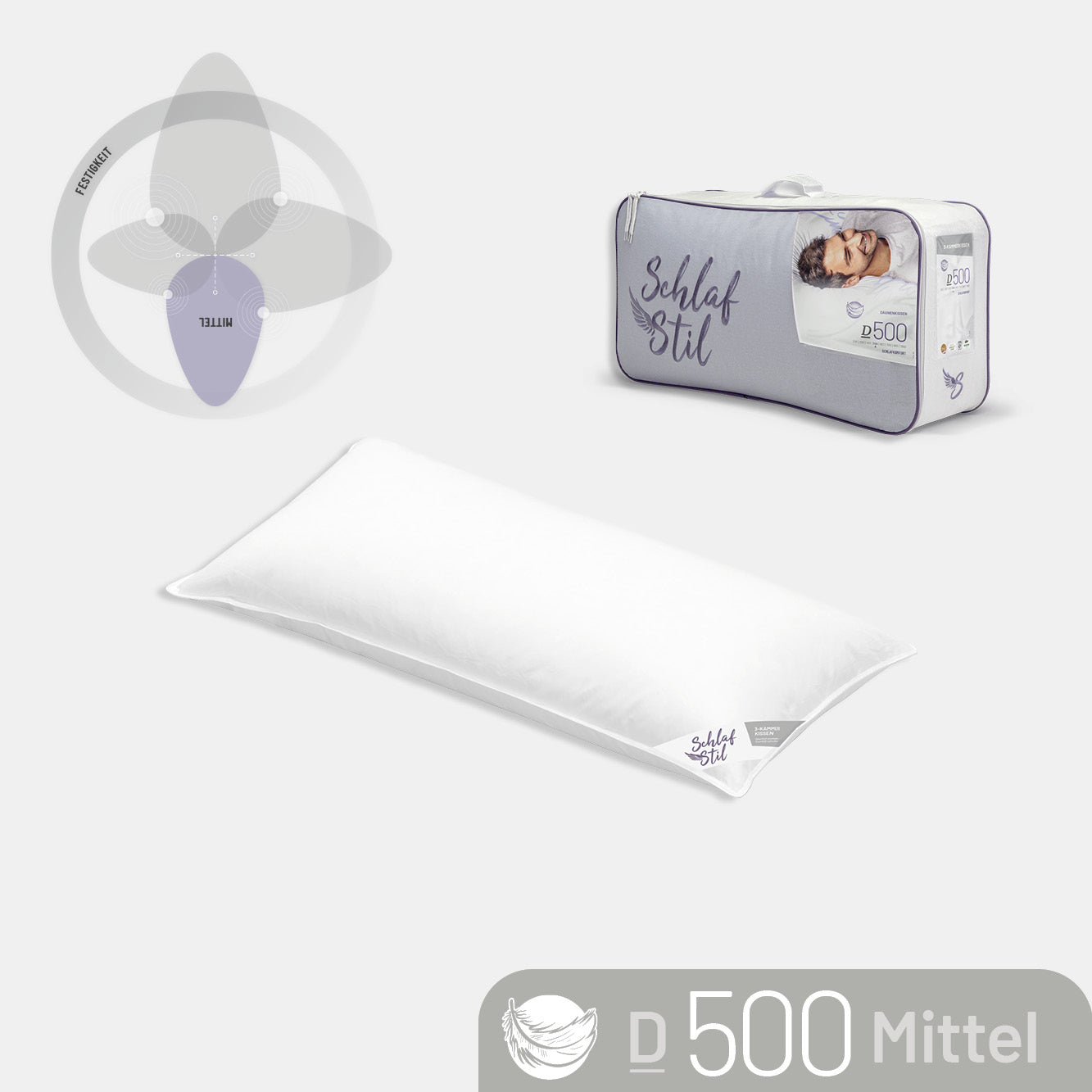 - D500 Nackenstützkissen: 6 oder 10 cm Außensteg, 90 % Daunen und 10 % Federn (Außen), 100 % Federn (Innen)