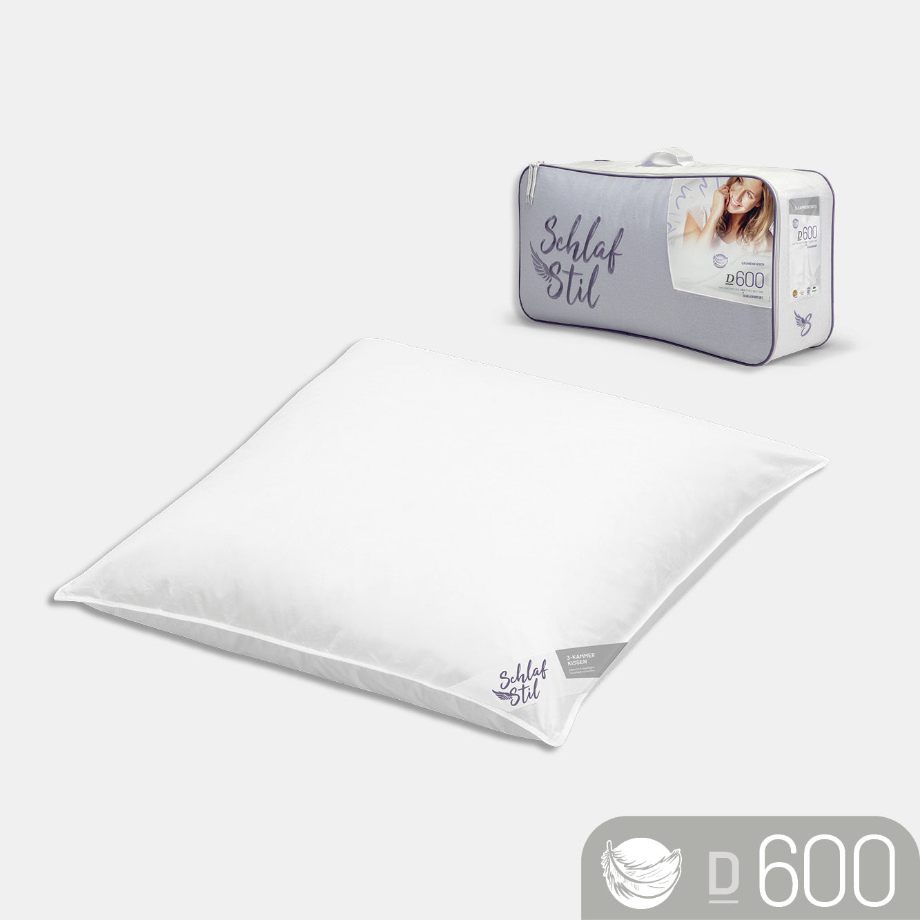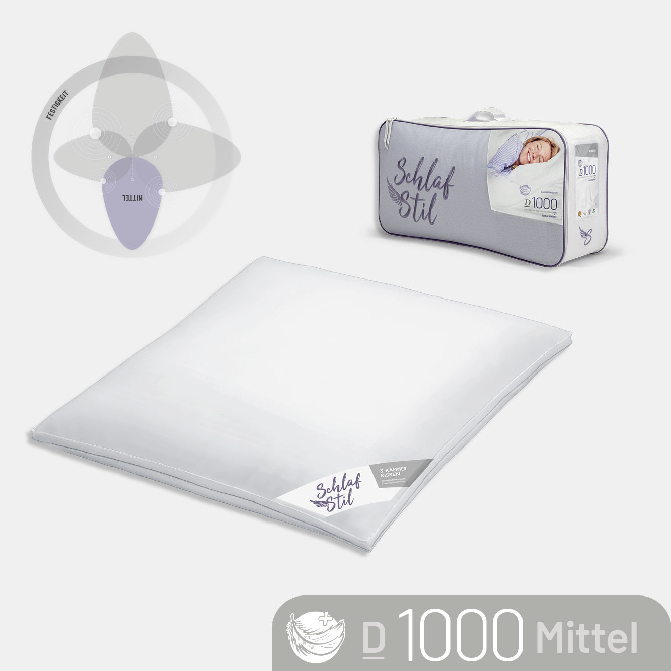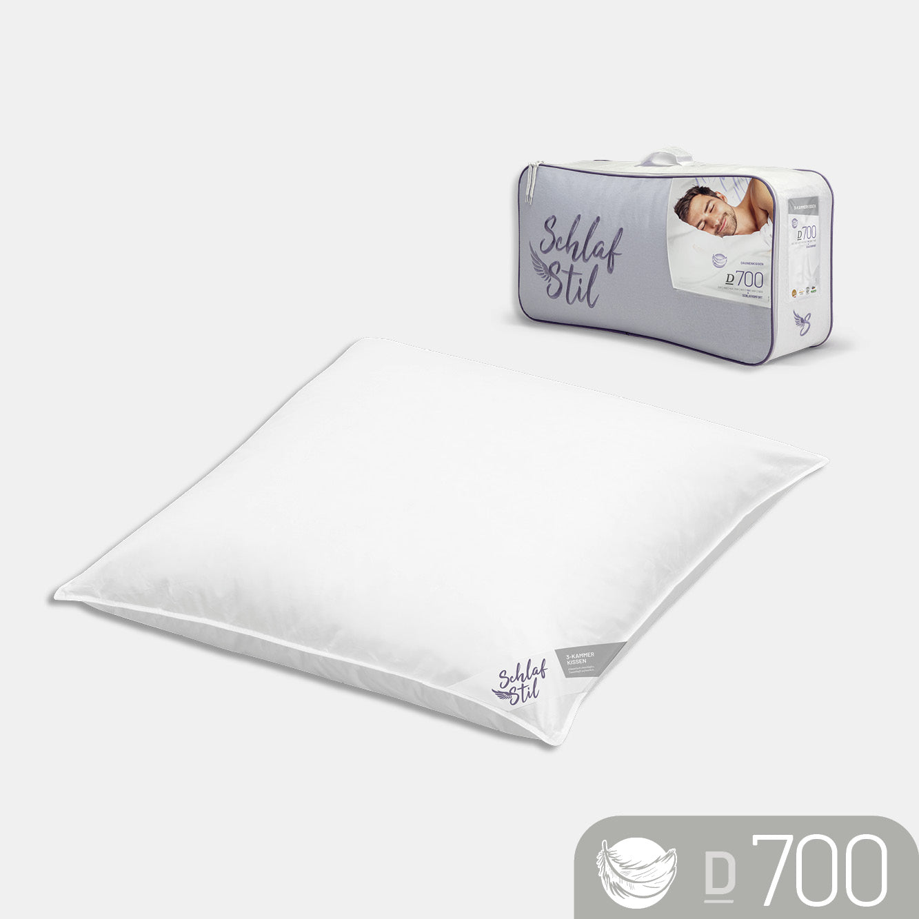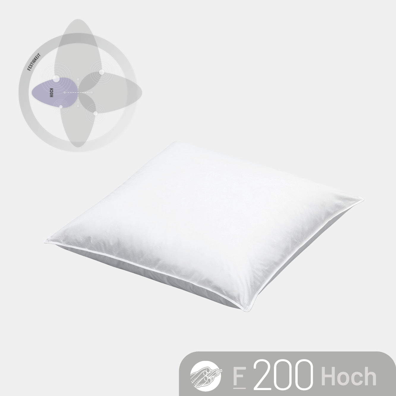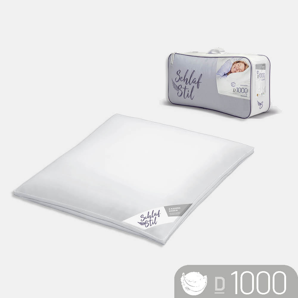 - 3-Kammer Kissen: 90 % Daunen und 10 % Federn (außen) mit 100 % Federn (innen) in feinem Daunen-Batist