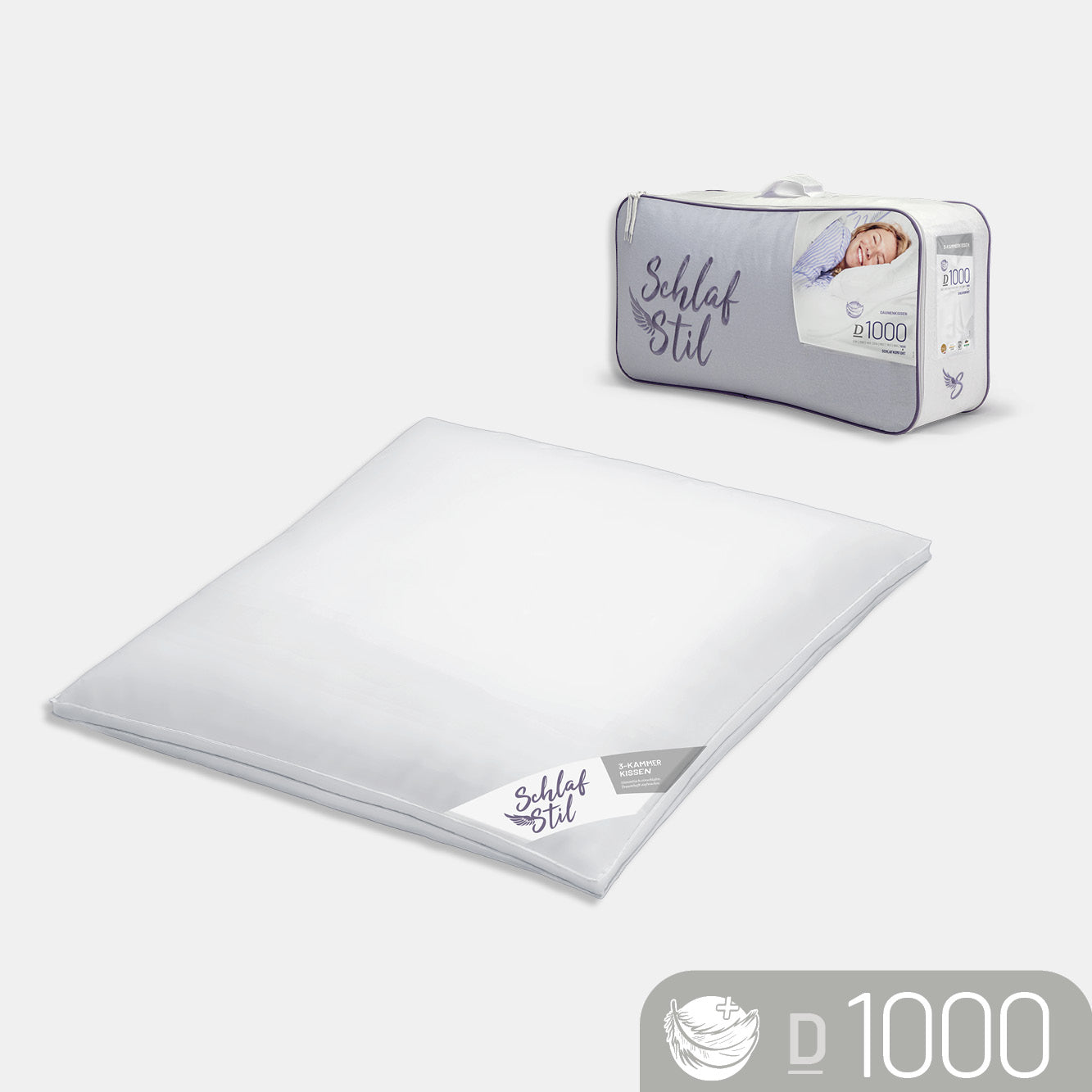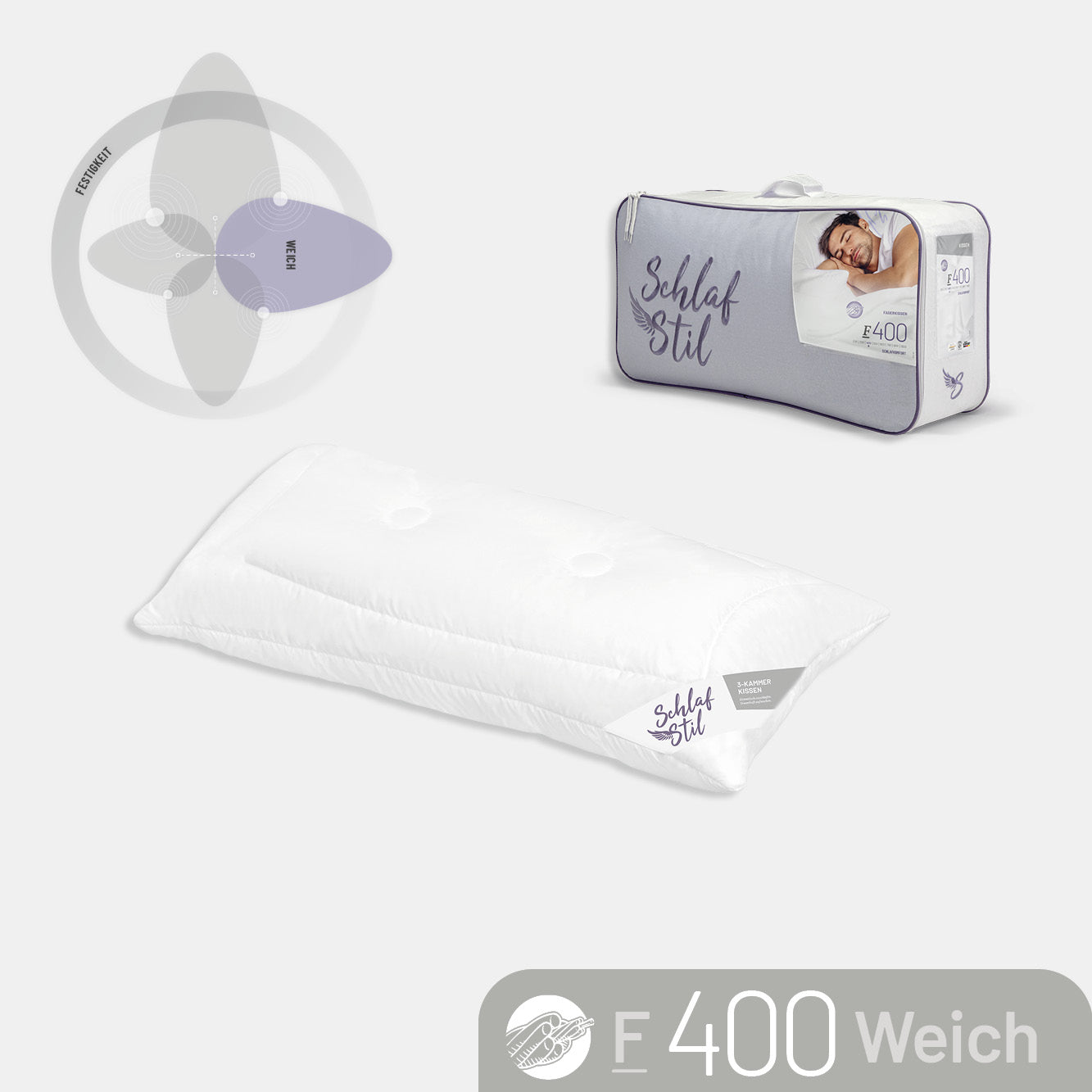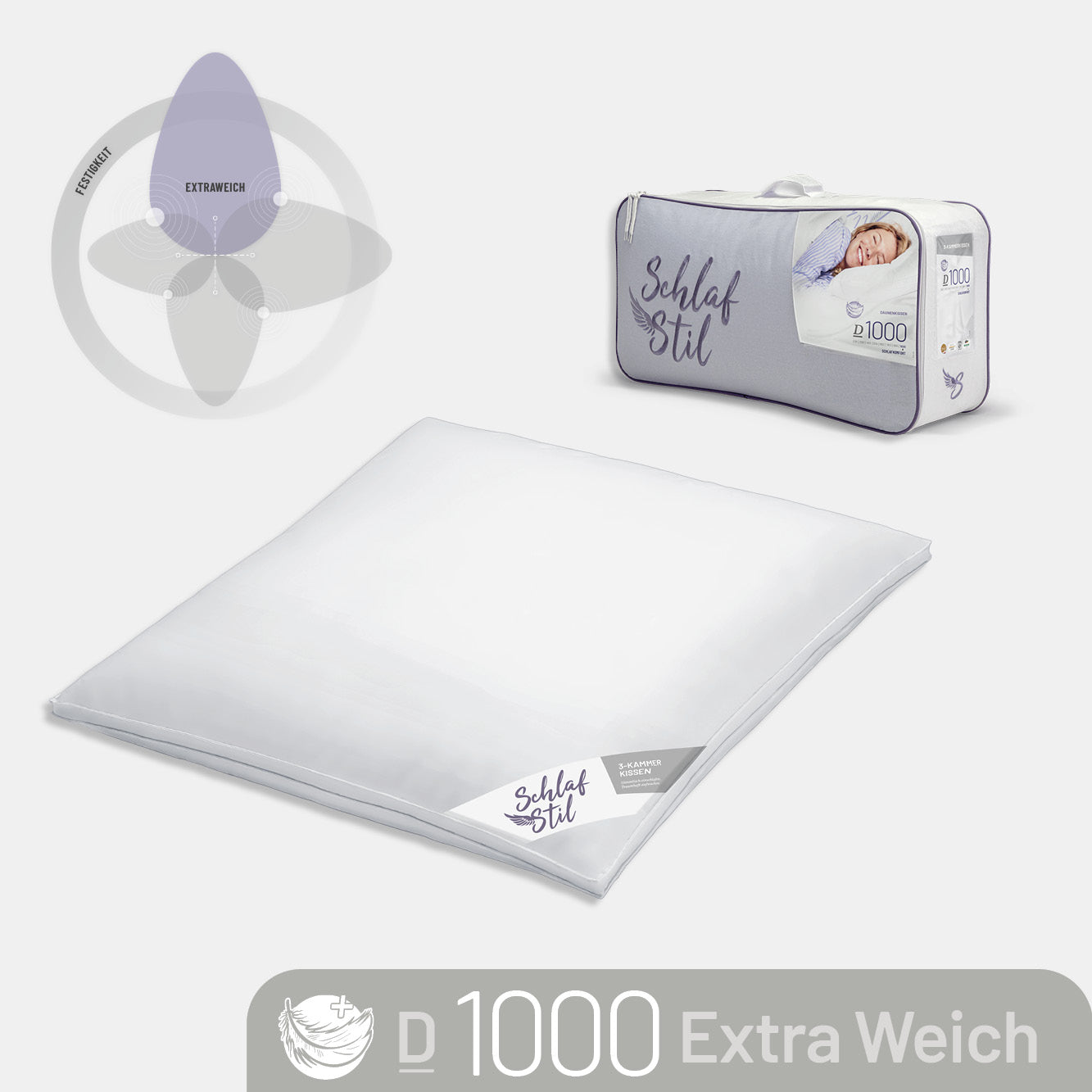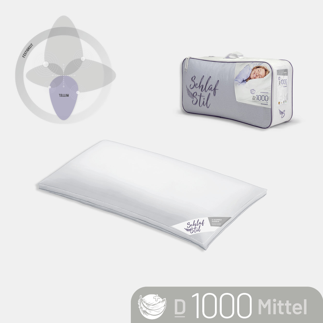 - 3-Kammer Kissen: 90 % Daunen und 10 % Federn (außen) mit 100 % Federn (innen) in feinem Daunen-Batist