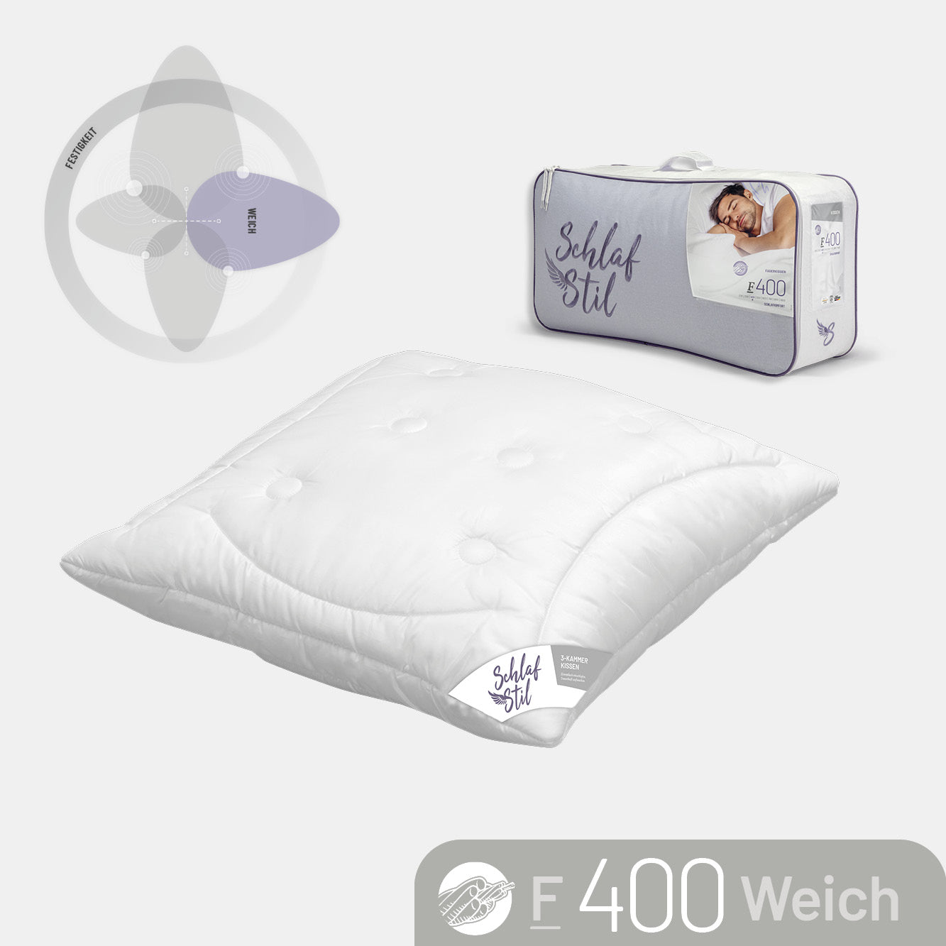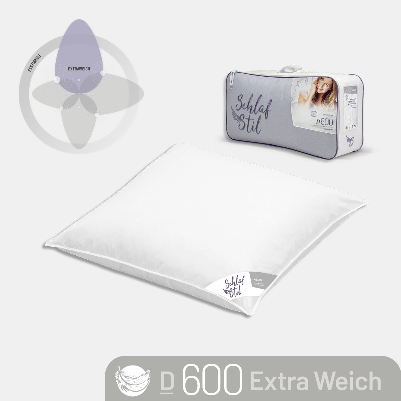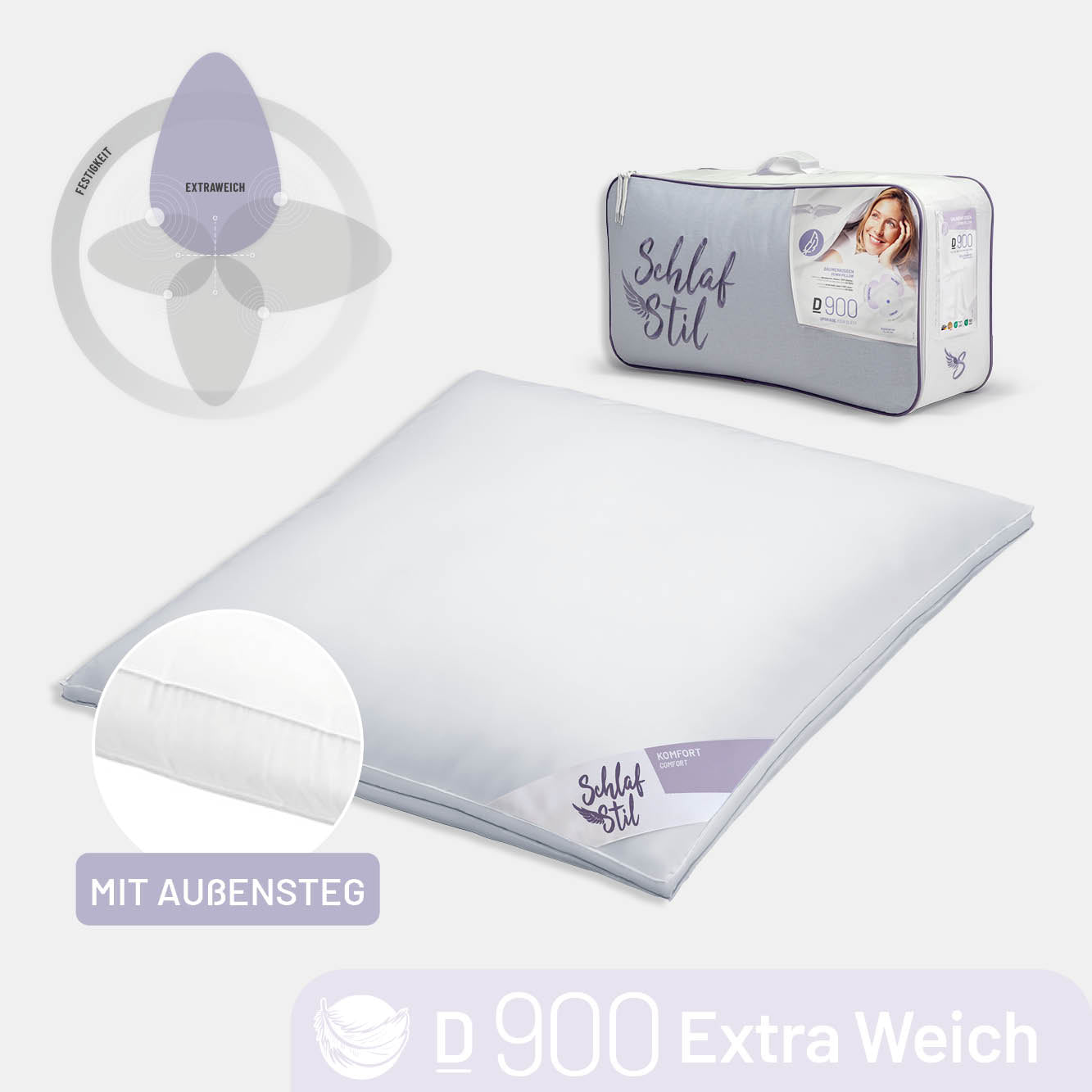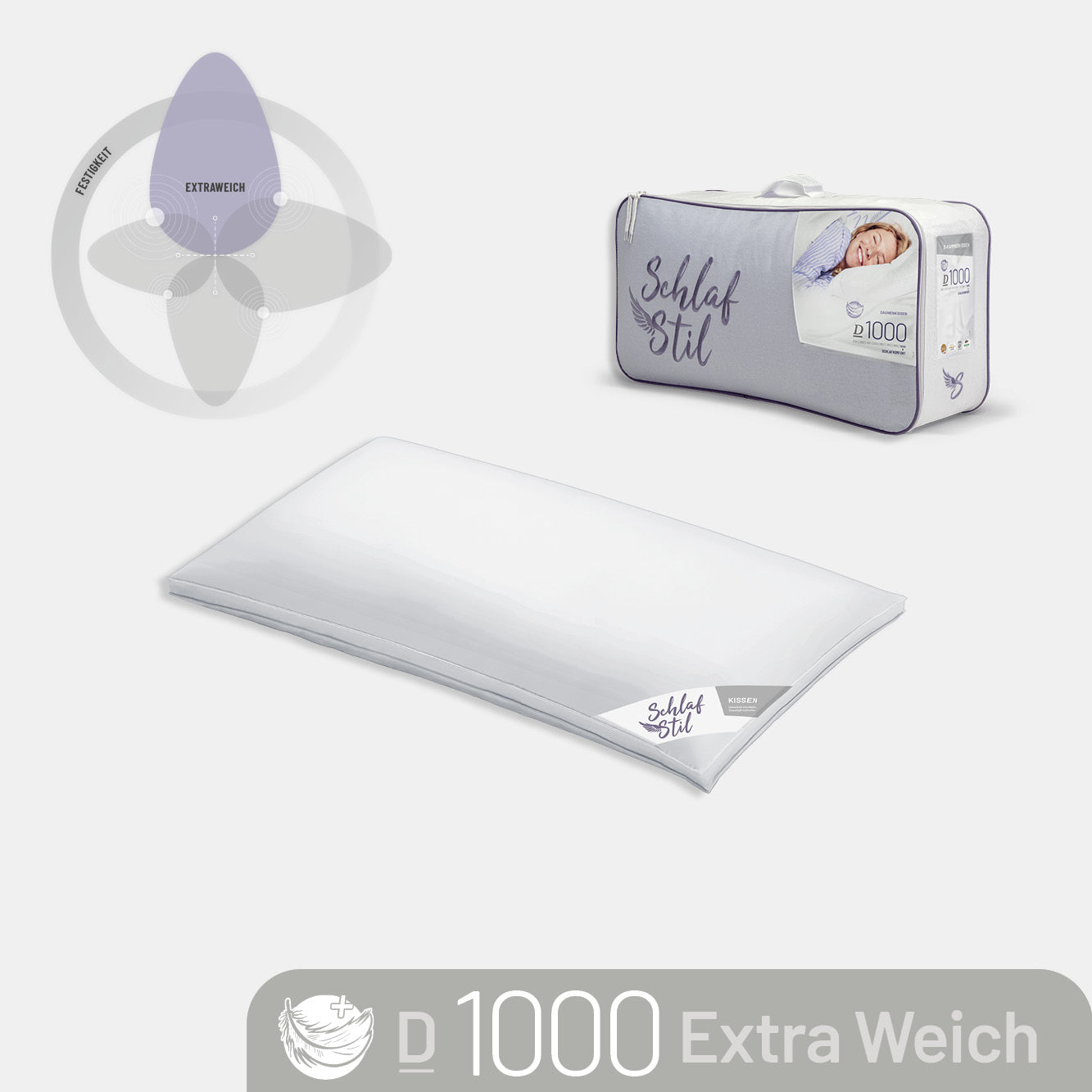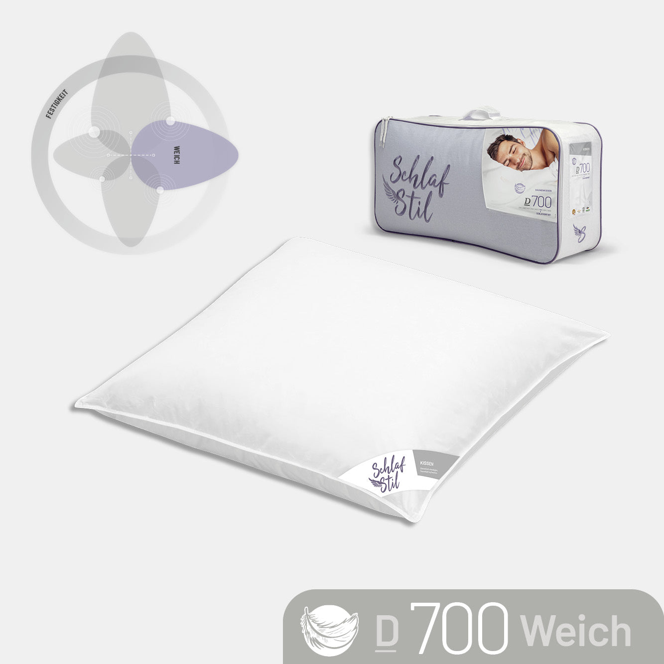- 3-Kammer Kissen: 90 % Daunen und 10 % Federn (außen) mit 100 % Federn (innen) in feinem Daunen-Batist