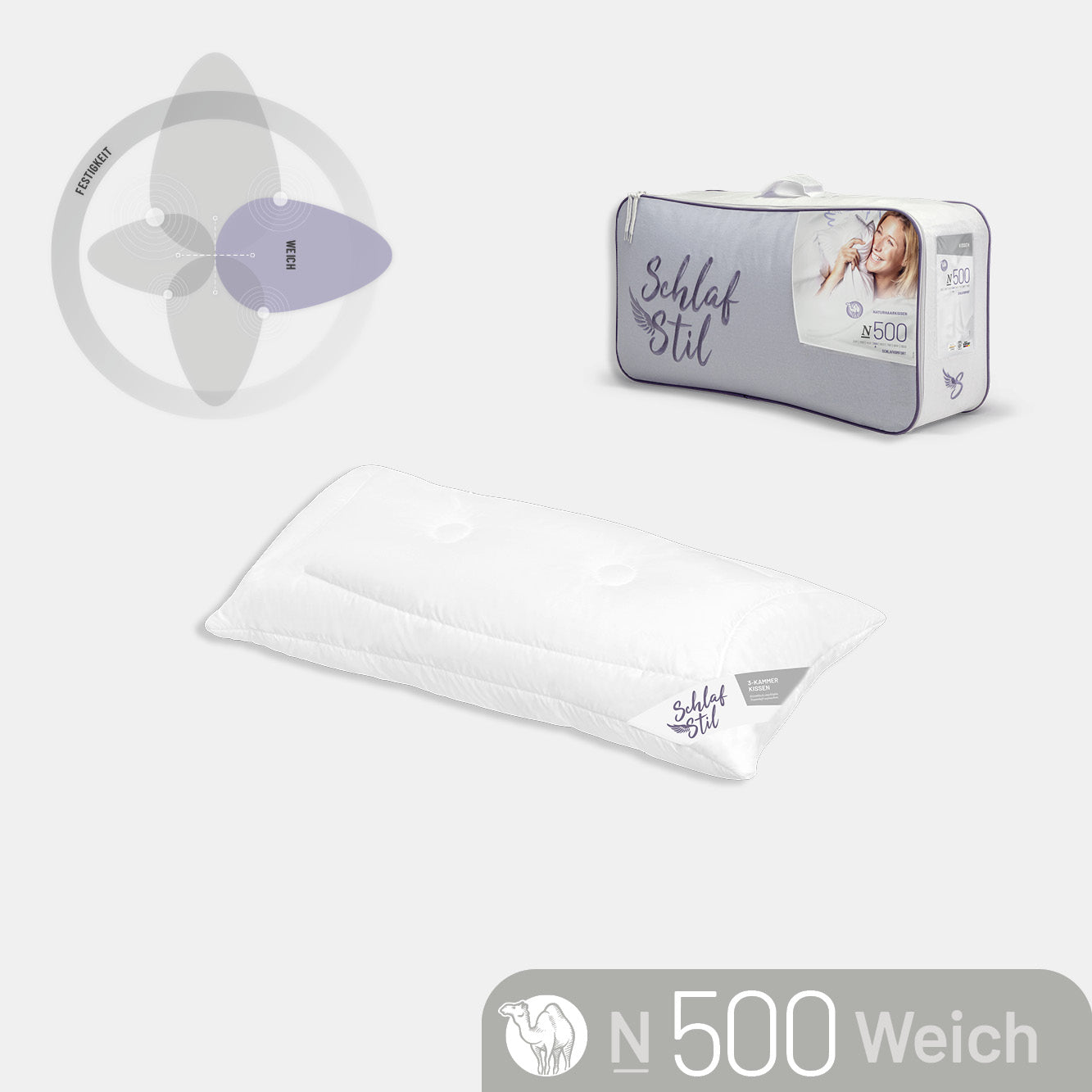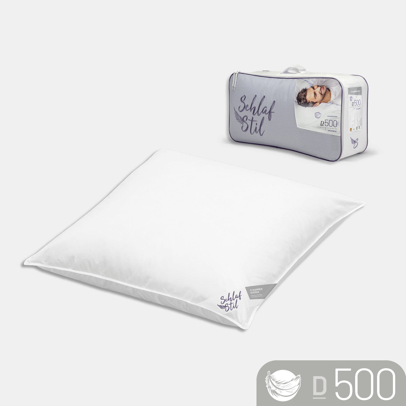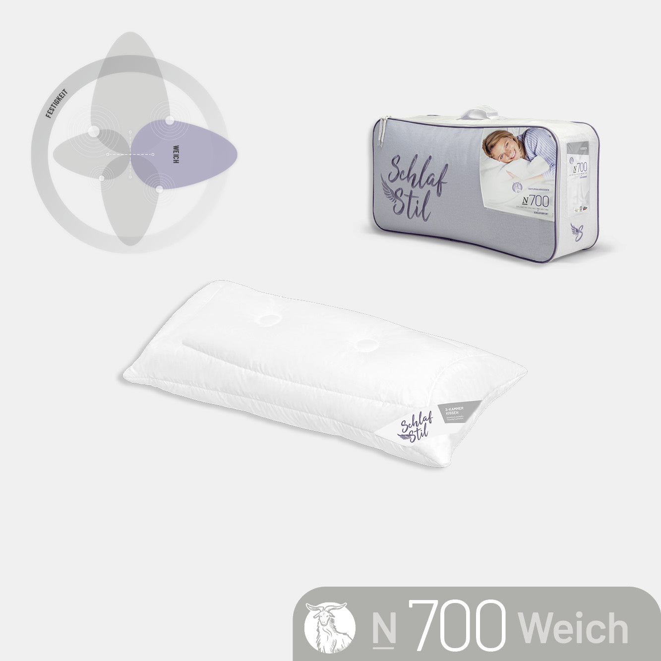 - 3-Kammer Kissen: 60 % Daunen und 40 % Federn (außen), 100 % Federn innen in feinem Daunen-Batist Nm 100