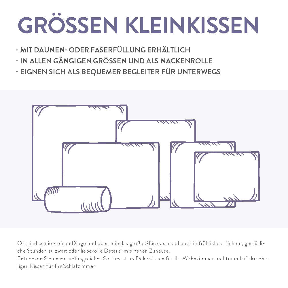 Als perfekte Ergänzung für Ihr persönliches Schlafparadies bieten wir Ihnen eine Auswahl hochwertigste Kleinkissen in gängigen Größen: 35x40 Kissen, 40x40 Kissen, 40x60 Kissen, 50x50 Kissen und als praktische Nackenrolle. Kleine Kissen sind als Federkissen und Microfaserkissen erhältlich. So wird auch ein Mittagsschlaf oder der gemütliche Ausklang auf dem Sofa eine wahre Wohltat.