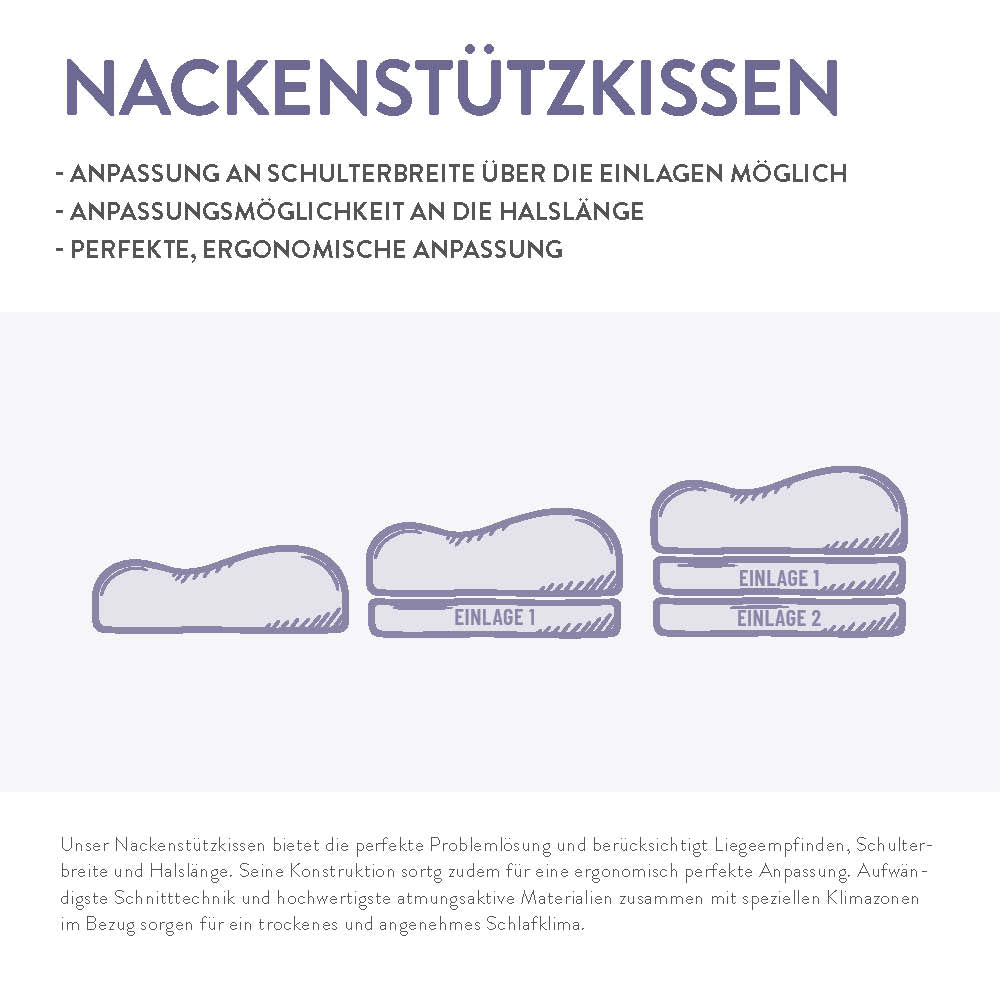 Wer zusätzliche Unterstützung für die Wirbelsäule benötigt, beispielsweise aus orthopädischen Gründen, findet ergonomische Nackenstützkissen. Wählen Sie bei Bedarf das Nackenstützkissen passend zu Schulterbreite, Halslänge und individuellem Liegeempfinden.