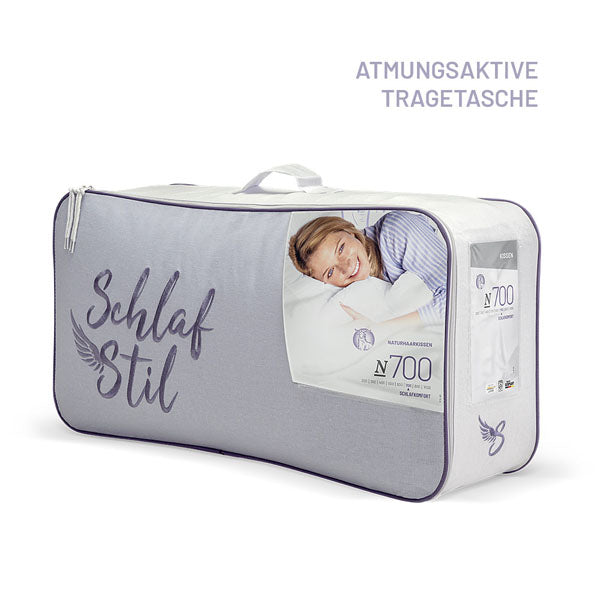 - 3-Kammer Kissen: 100 % Gänsedaunen (außen) und 100 % Gänsefedern (innen) in feinstem Mako-Batist Nm 100